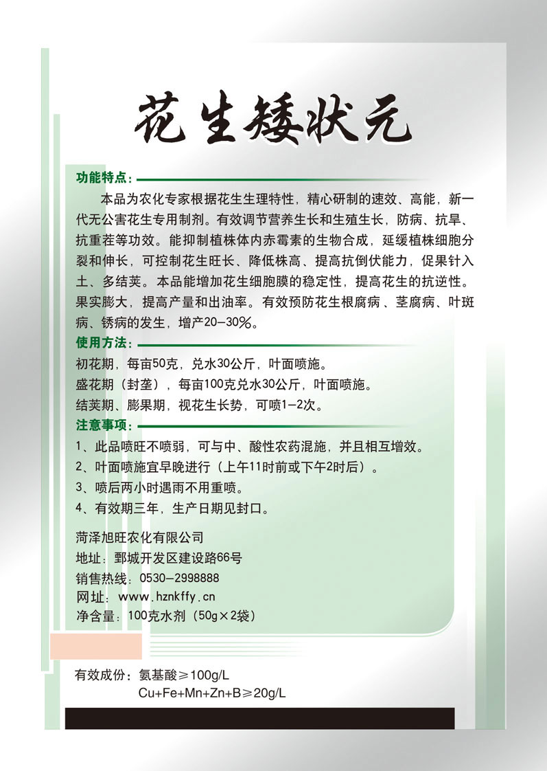 本品為農(nóng)化專家根據(jù)花生生理特性,精心研制的速效、高能,新一代無公害花生專用制劑。有效調(diào)節(jié)營養(yǎng)生長和生殖生長,防病、抗旱、扛重茬等功效。能抑制植株體內(nèi)赤霉素的生物合成,延緩植株細胞分裂和生長,可控制花生旺長、降低株高、提高抗倒伏能力,促果針入土,多結莢。本品能增加花生細胞膜的穩(wěn)定性,提高花生的抗逆性。果實膨大,提高產(chǎn)量和出油量。有效預防花生根腐病、莖腐病、葉斑病、銹病的發(fā)生,增產(chǎn)20℅–30℅。
