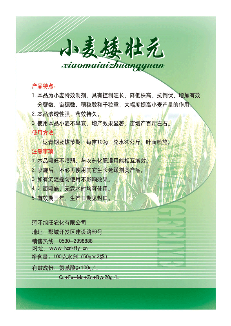 1.本品為小麥特效制劑,具有控制旺長、降低株高、抗倒伏、增加有效分蘗數(shù)、穗粒數(shù)和千粒重,大幅提高小麥產(chǎn)量的作用。2.本品滲透性強(qiáng),藥效持久。3.使用本品小麥不早衰,增產(chǎn)效果顯著,畝增產(chǎn)百斤左右。