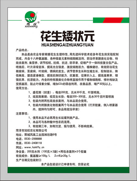 本產(chǎn)品是由農(nóng)業(yè)專家根據(jù)花生生理特性,用先進(jìn)科學(xué)技術(shù)配制而成。含有十八種氨基酸,多種微量元素和細(xì)胞賦活劑。防治早衰胺類化合物,特效殺菌劑、集營(yíng)養(yǎng)、調(diào)節(jié)控旺、抗病、抗逆,增產(chǎn)于一體的高科技產(chǎn)品。噴施后,葉片濃綠變厚,提高光合強(qiáng)度。激發(fā)細(xì)胞活力,有效預(yù)防花生根腐病,莖腐病,葉斑病,銹病的的發(fā)生。調(diào)節(jié)營(yíng)養(yǎng)生長(zhǎng)和生殖生長(zhǎng),控制徒長(zhǎng),降低株高,提高抗倒伏能力,抗重茬。促果針入土,提高座果率,增強(qiáng)抗旱,抗?jié)衬芰?。?nèi)含的特有胺類化合物將直接作用于細(xì)胞核,修補(bǔ)殘缺基因,阻止葉綠素分解,增加二氧化炭的吸收利用,改善品質(zhì),根治早衰,增產(chǎn)30℅以上。