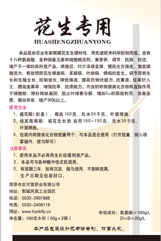 本產(chǎn)品是由農(nóng)業(yè)專家根據(jù)花生生理特性,用先進(jìn)科學(xué)技術(shù)配制而成。含有十八種氨基酸,多種微量元素和細(xì)胞賦活劑。集營養(yǎng)、調(diào)節(jié)、抗病、抗逆,增產(chǎn)于一體的高科技產(chǎn)品。噴施后,葉片濃綠變厚,提高光合強(qiáng)度。激發(fā)細(xì)胞活力,有效預(yù)防花生根腐病,莖腐病,葉斑病,銹病的的發(fā)生。調(diào)節(jié)營養(yǎng)生長和生殖生長,控制徒長,降低株高,提高抗倒伏能力,抗重茬。促果針入土,提高座果率,增強(qiáng)抗旱,抗?jié)衬芰?。?nèi)含的特有胺類化合物將直接作用于細(xì)胞核,修補(bǔ)殘缺基因,阻止葉綠素分解,增加Co2的吸收利用,改善品質(zhì),根治早衰,增產(chǎn)30以上。