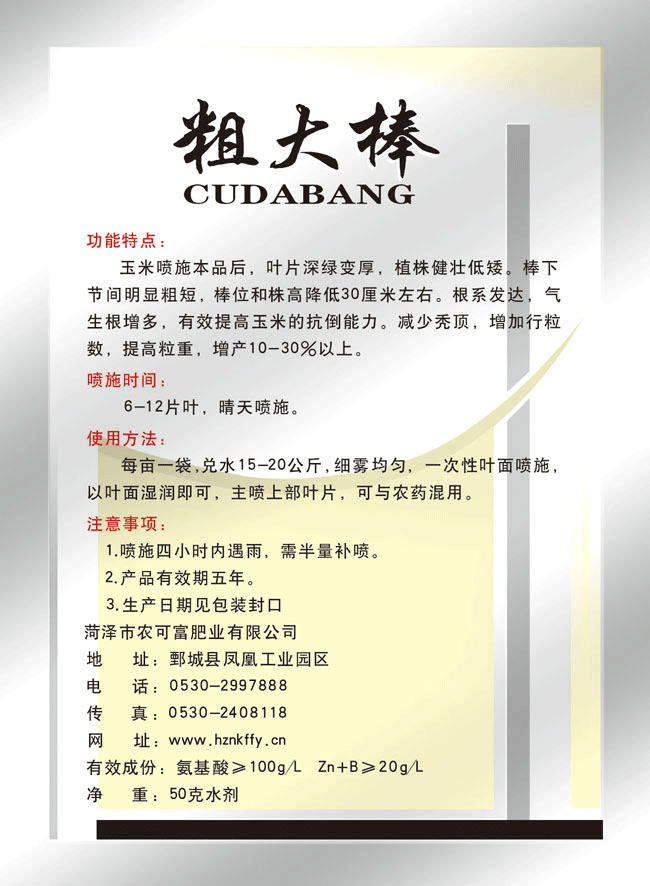 玉米噴施本品后,葉片深綠變厚,植株健壯低矮。棒下節(jié)間明顯粗短,棒位和株高降低30厘米左右。根系發(fā)達,氣生根多,有效提高玉米的扛倒能力。減少禿頂,增加行粒數(shù),提高粒重,增產1030以上。