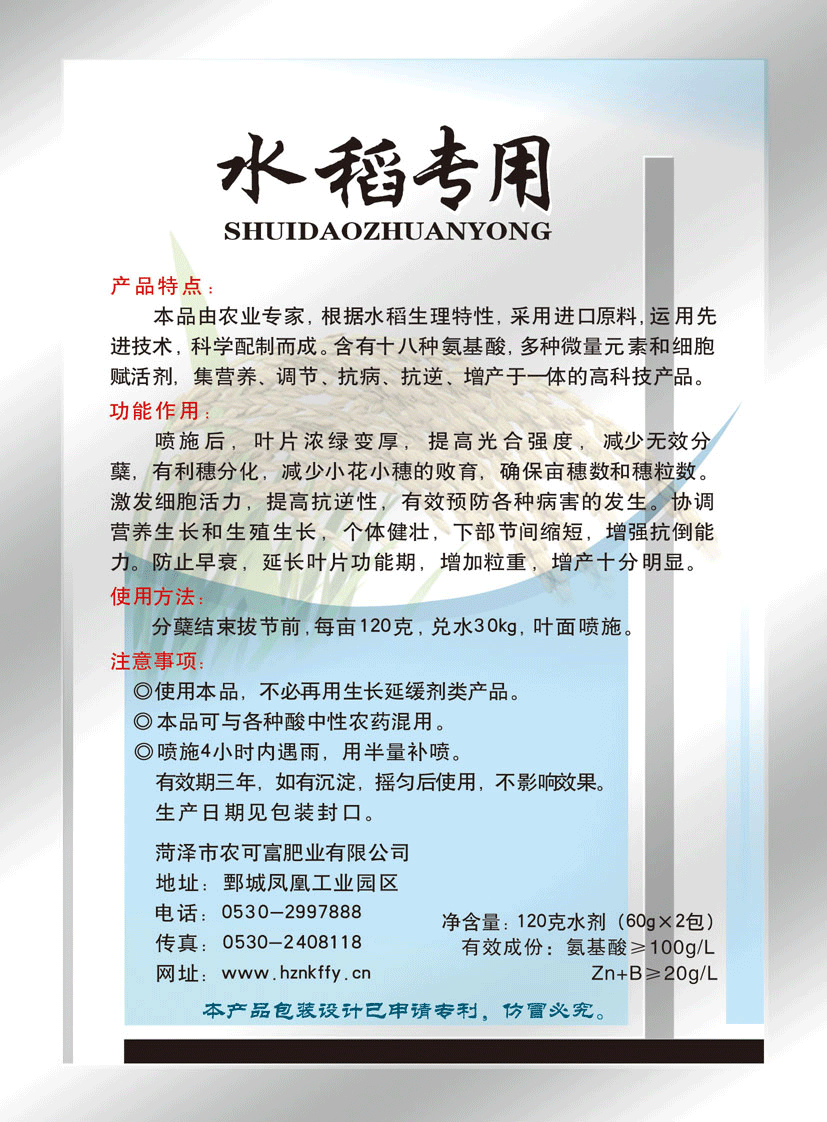 噴施后,葉片濃綠變厚,提高光合強(qiáng)度,減少無效分蘗,有利穗分化,減少小穗小花的敗育,確保畝穗數(shù)和穗粒數(shù)。激發(fā)細(xì)胞活力,提高抗逆性,有效預(yù)防各種病害的發(fā)生。協(xié)調(diào)營養(yǎng)生長和生殖生長,個(gè)體健壯,下部節(jié)間縮短,增強(qiáng)抗倒能力。防止早衰,延長葉片功能期,增加粒重,增產(chǎn)十分明顯。