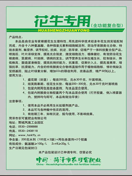 本產(chǎn)品是由農(nóng)業(yè)專家根據(jù)花生生理特性,用先進科學(xué)技術(shù)配制而成。含有十八種氨基酸,多種微量元素和細胞賦活劑。防治早衰胺類化合物,特效殺菌劑、集營養(yǎng)、調(diào)節(jié)控旺、抗病、抗逆,增產(chǎn)于一體的高科技產(chǎn)品。噴施后,葉片濃綠變厚,提高光合強度。激發(fā)細胞活力,有效預(yù)防花生根腐病,莖腐病,葉斑病,銹病的的發(fā)生。調(diào)節(jié)營養(yǎng)生長和生殖生長,控制徒長,降低株高,提高抗倒伏能力,抗重茬。促果針入土,提高座果率,增強抗旱,抗?jié)衬芰Α?nèi)含的特有胺類化合物將直接作用于細胞核,修補殘缺基因,阻止葉綠素分解,增加二氧化炭的吸收利用,改善品質(zhì),根治早衰,增產(chǎn)30℅以上。